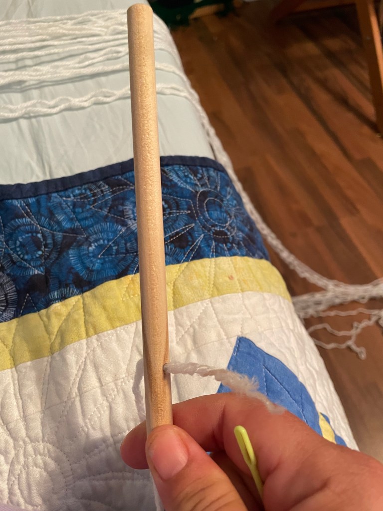 I have pictures below of how to go ahead and prepare the loom by inserting yarn into the hole of the dowels and tying the end together. The yarn is woven around the dowels. Once the yarn is built up on the dowels, the pegs are removed one by one and the yarn slipped down. In that manner, the weaving grows down and down the warp.