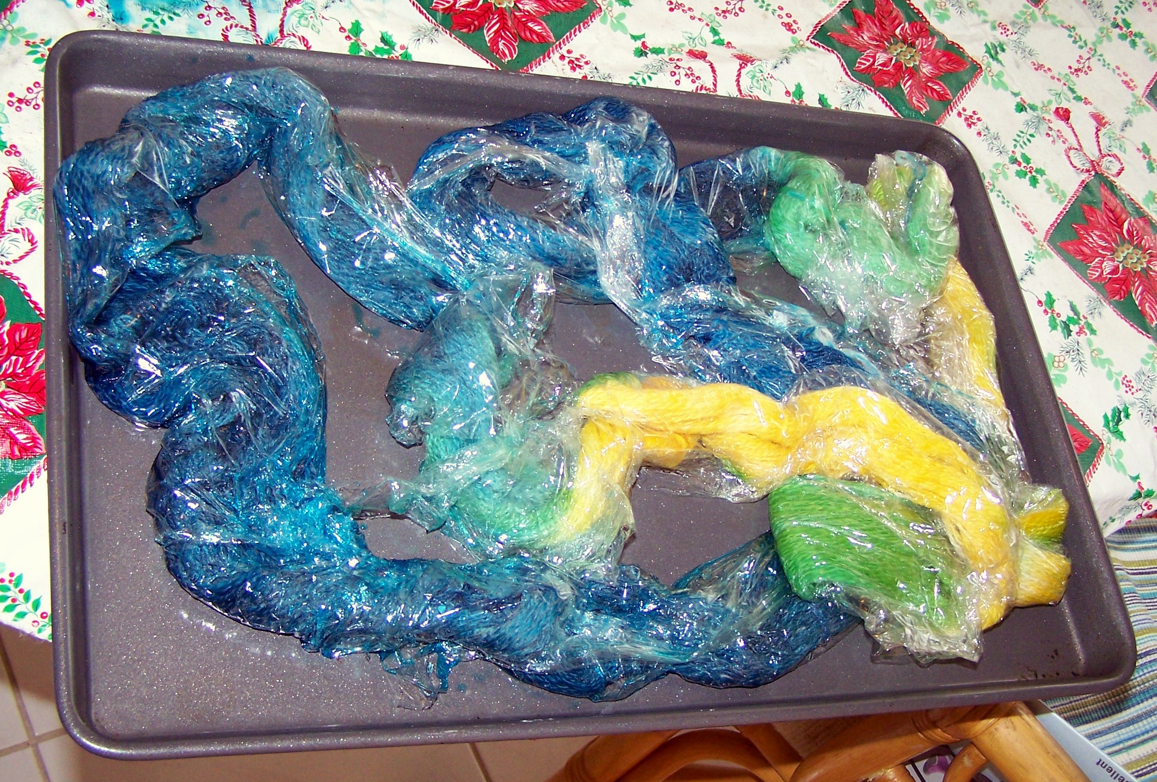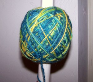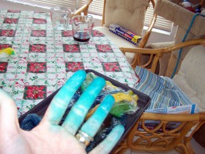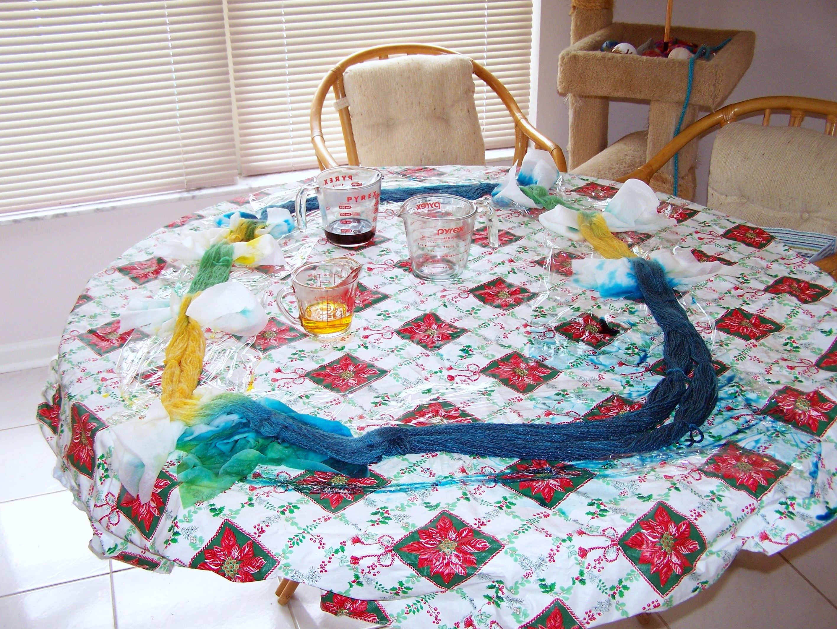 3- Out of my dye pot. Okay, this was never actually in a dye pot. I used the Knitty instructions with the Cold Pour Method. I thought this came out wonderful. I even created a giant niddy noddy with pvc to skein it up. I put an old plastic Christmas tablecloth on the kitchen table before I started. I wasn’t sure how messy this would get. I did put paper towels under the different colored sections to prevent mixing. As you can see from the pictures below, I wound up with blue hands and there is a green fingerprint in a yellow section of yarn. All in all, I think it was great. I’m sending this off to Mom so I won’t have finished project pictures unless she provides them.