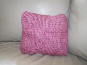 With right sides together, sew together the edges of the pillow. Leave about a 2-3 inch opening. Turn pillow so that right sides are facing out, stuff with fiber fill of your choice and seam together 2-3 inch opening. Using Caron Simply Soft yarn and size five needles, this creates a 10×10 inch pillow.