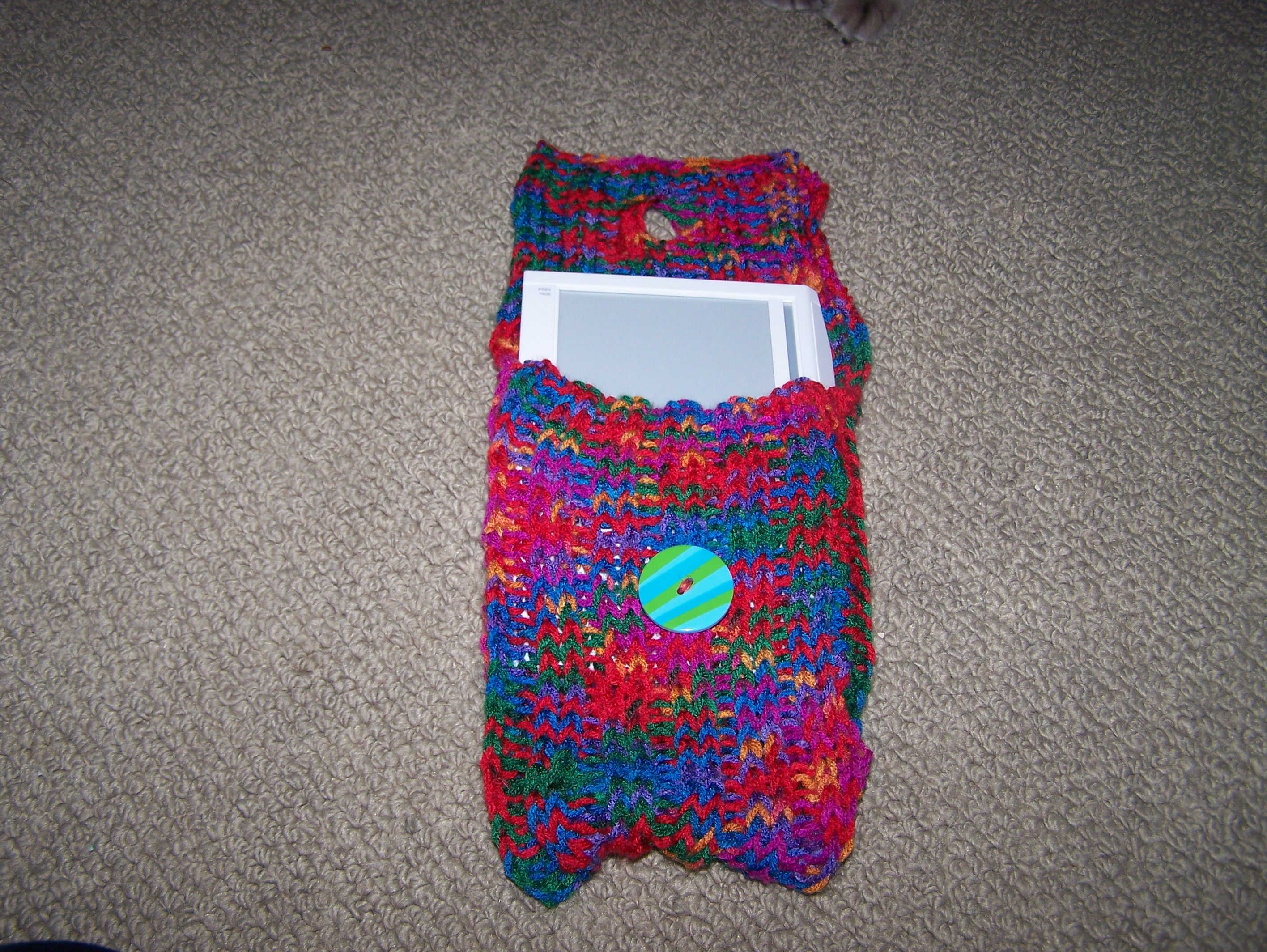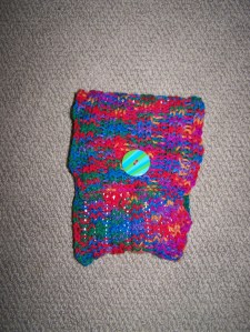 I decided to knit a case! Surprise! I pulled out some colorful old yarn, Caron Simply Soft Embroidery Print. This yarn is slightly thicker than the regular Caron Simply Soft Yarn. I love the bright colors and have made some eye catching cat toys out of it.