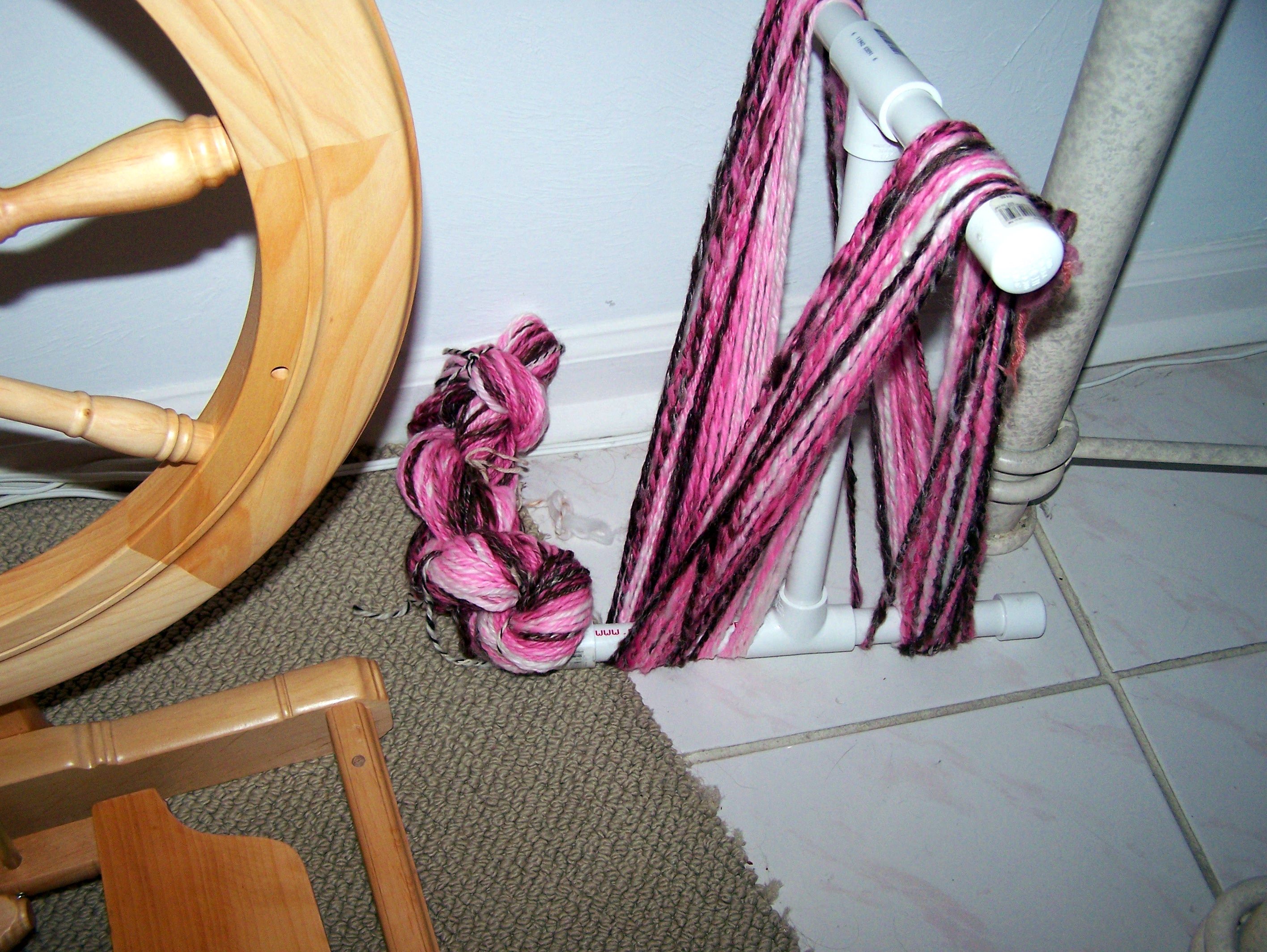 I have some wool/mohair mix that friend gave me and I decided I would try a few new things that I’m looking forward to. It spins up real easily. I started this yesterday and then the hubby and I went to a neighbor’s party. I don’t know if anyone else has this problem, but if I have more than one drink, I can’t sleep! So, I wake up repeatedly this morning and finally around 6 am I give up. With a glass of water and a cup of coffee, I sit in front of the spinning wheel.The rest of the wool/mohair mix spins up quickly and I go to navajo ply it. I try and try and try but I can’t get the flyer to pick it up. The yarn keeps breaking. I was really looking forward to navajo plying and then dyeing it with food coloring. Uh well.  I finally give up and pick up my socks that I’m making with my homespun.