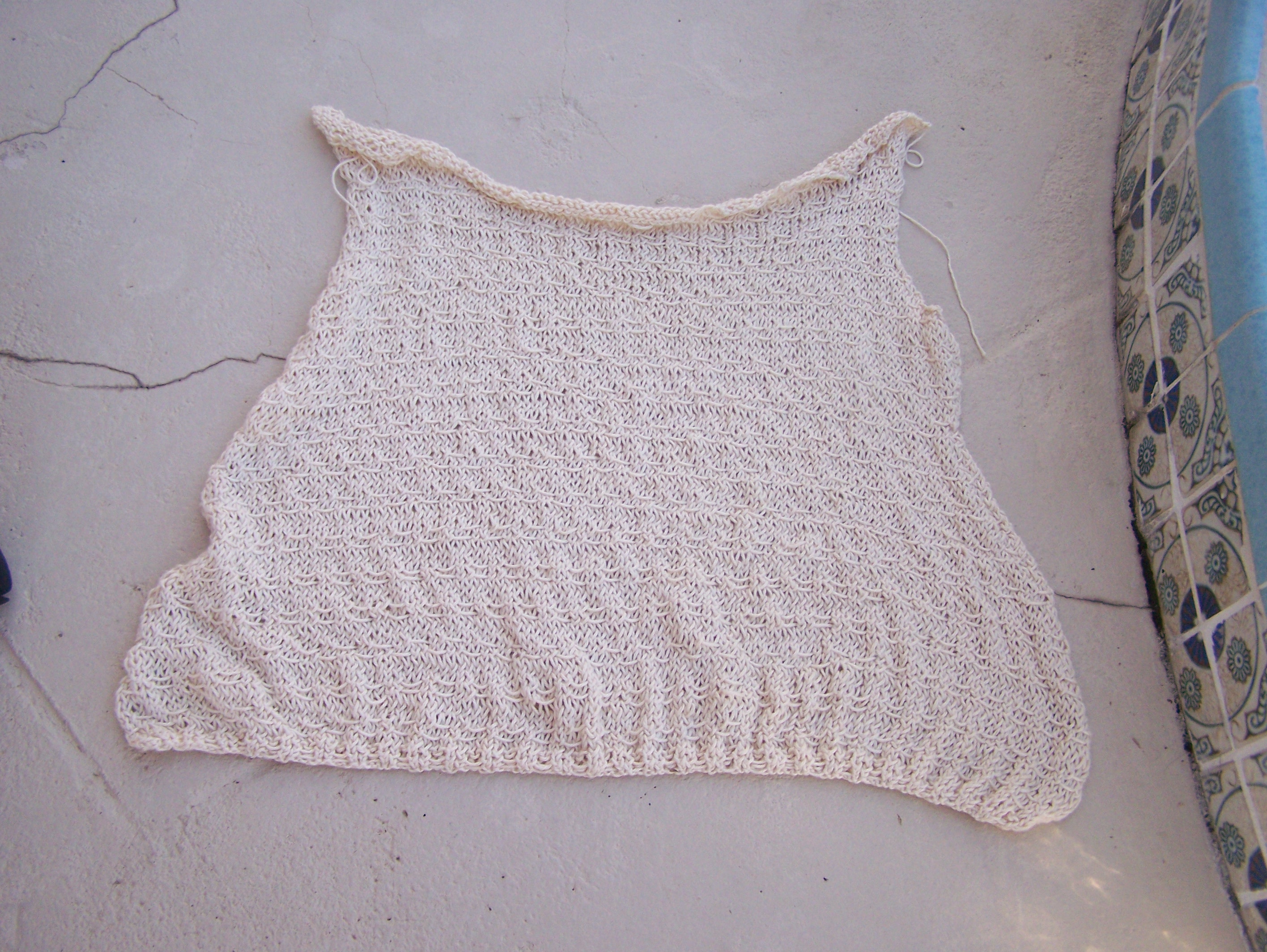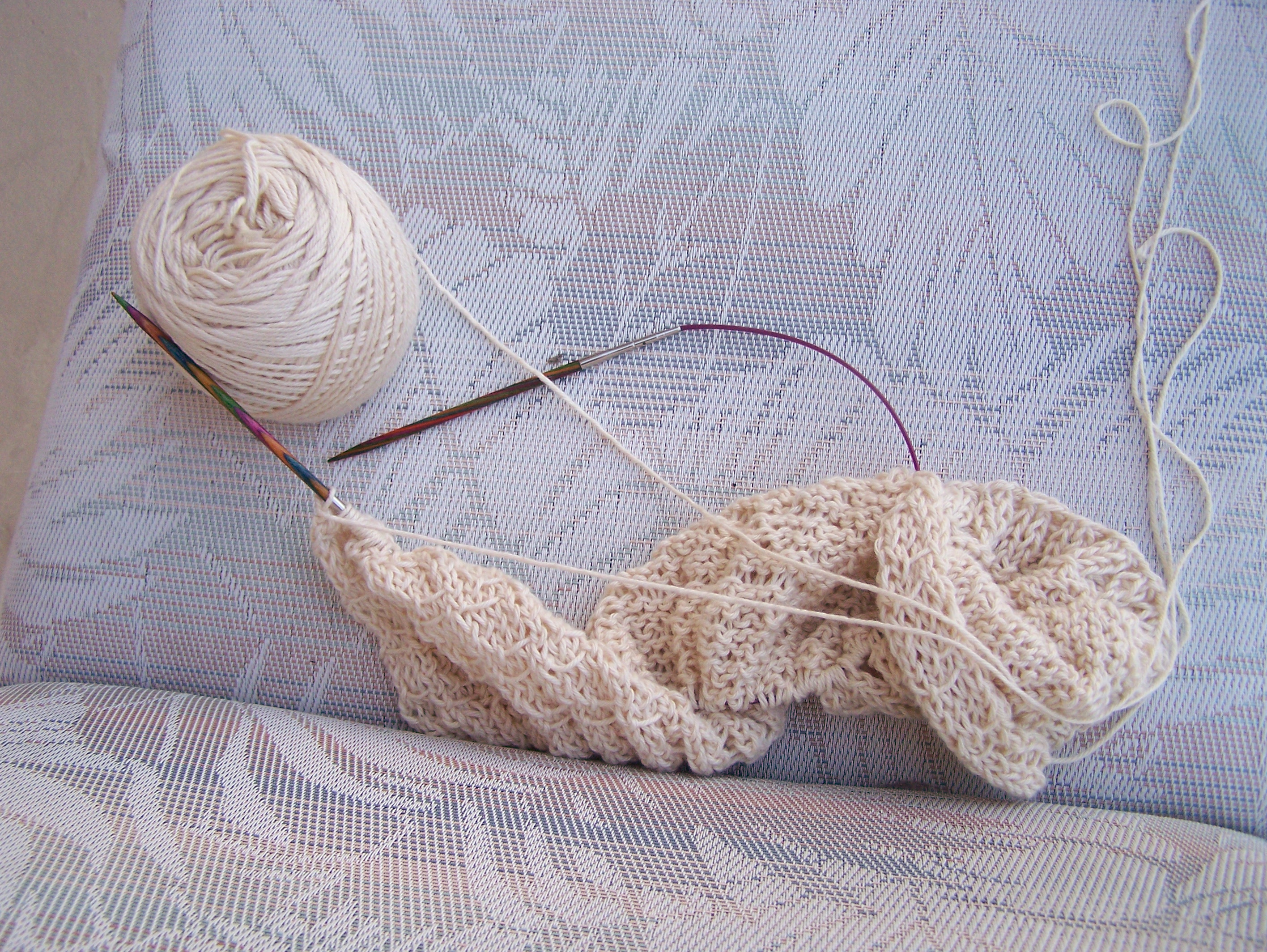 Two weeks ago, when I was still on vacation, we took a trip to the Miami area to run errands and so that I could go to one of my favorite knitting shops. The Knitting Garden is a very nicely set up shop with a comfortable atmosphere. It’s located off of Ponce De Leon Boulevard in Coral Gables. I bought four skeins of off white Misti Alpaca Pima Cotton and Silk blend. I was mentally drunk at the time (you know when you feel all light-headed and giggly but he haven’t had any alcohol and you decide to do something that is against your better judgement.) Maybe I was drunk on yarn, surrounded by all those magical varieties of soft shiny material that I could transform into useful objects. So I handed my credit card over and held my eyes tightly shut.